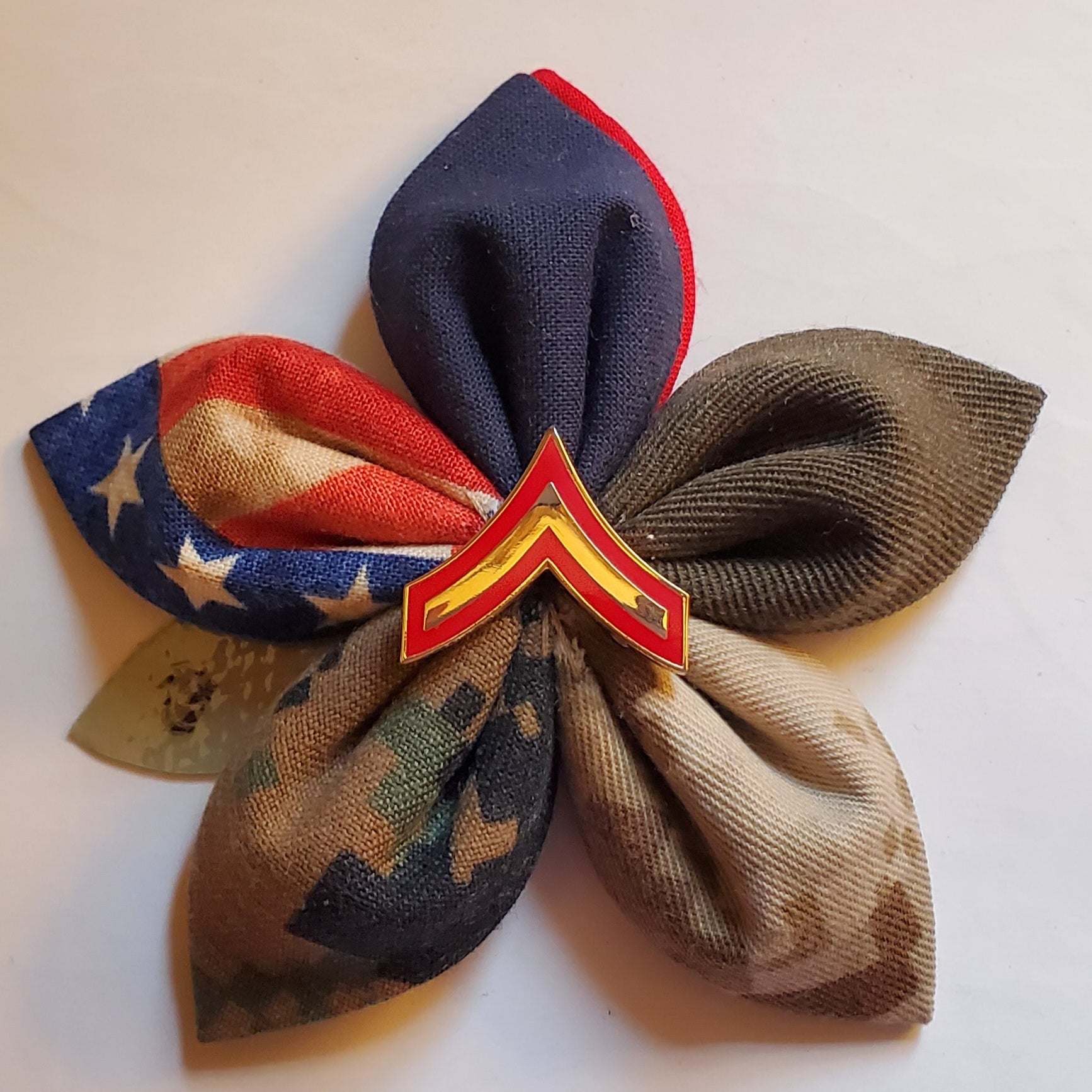 In order to help Marine loved ones celebrate each exciting promotion, the Rank Blossom petals include all 4 current use uniforms plus the flag they protect, centered with a pin displaying their rank. Available for PFC, LCpl, Cpl, Sgt and SSgt.